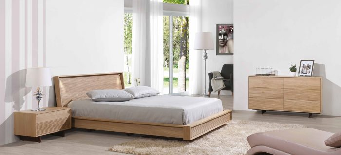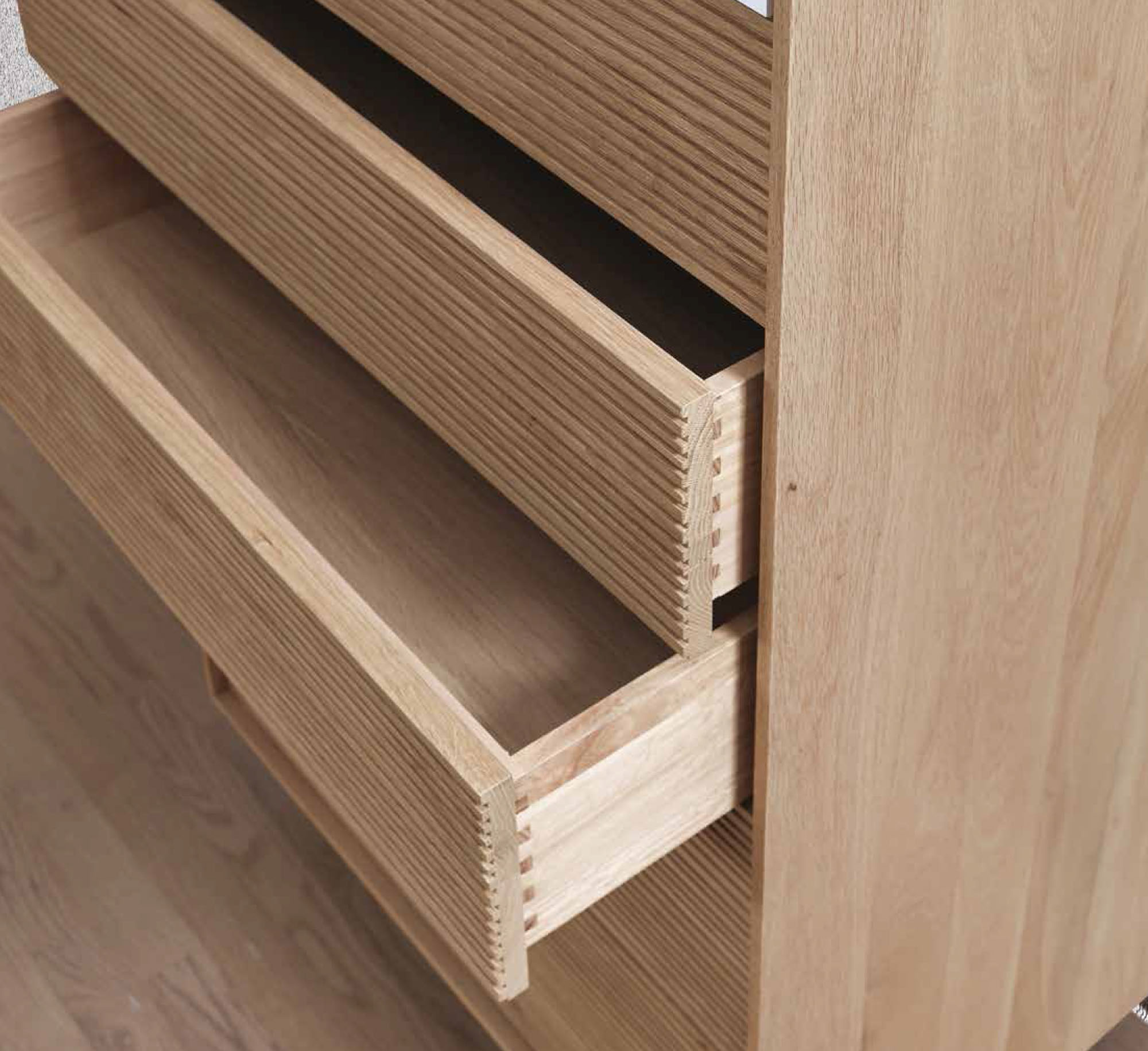 Composition fabriquée en chêne massif dans sa totalité. Le design de l’ensemble a une composition horizontale marquée par la finition des faces rainurées.