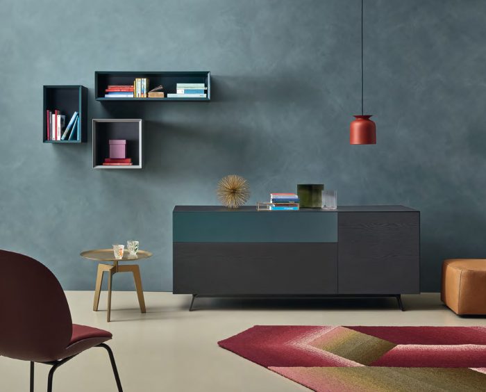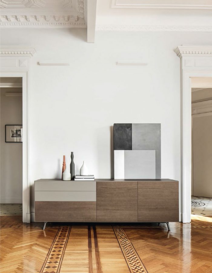 El mueble se asienta sobre patas metálicas con cierta inclinación con respecto al eje vertical.