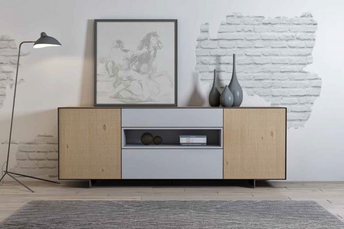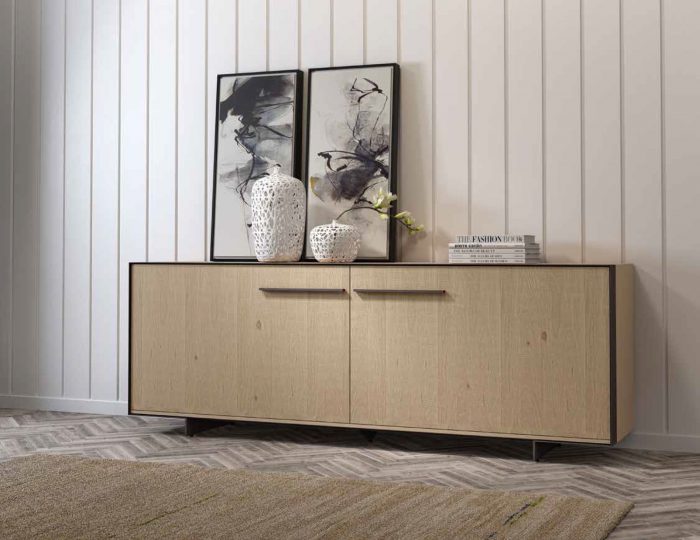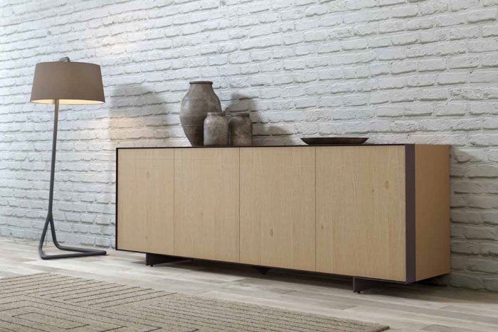 Aparador suspendido sobre pletinas de hierro que enmarca la composición del mueble.