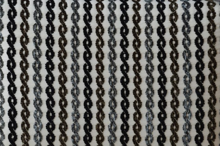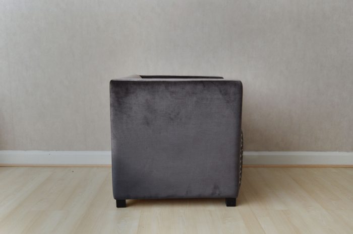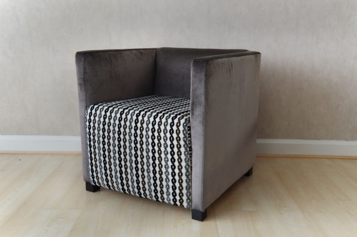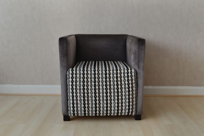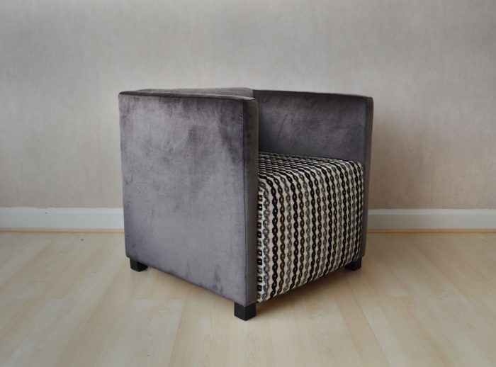 Acabado en terciopelo gris y asiento con motivos geométricos.