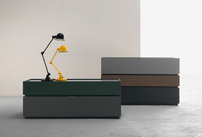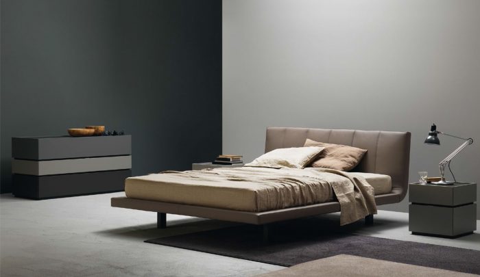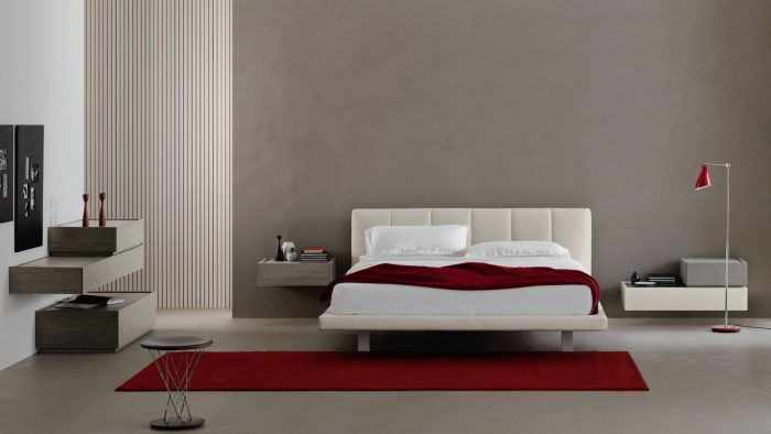 Cama con cabecero y estructura tapizada en piel o en polipiel.La estructura se puede suspender sobre patas o sobre una bancada elevable, albergando un espacio de almacenamiento de 16 cm de altura.