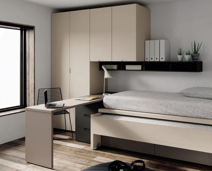 Dormitorio juvenil equipado con cama, una segunda cama extraíble y cajones debajo.