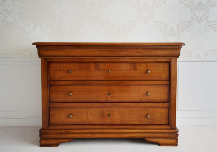 La cómoda consta de 3 cajones y un cuarto insertado en la moldura.