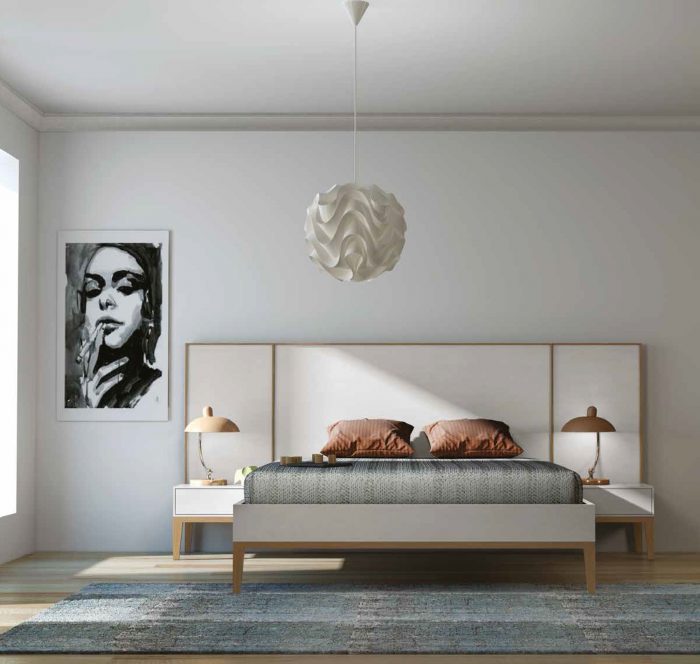 El cabecero, la cama y las mesillas forman un conjunto homogéneo de marcada composición horizontal.