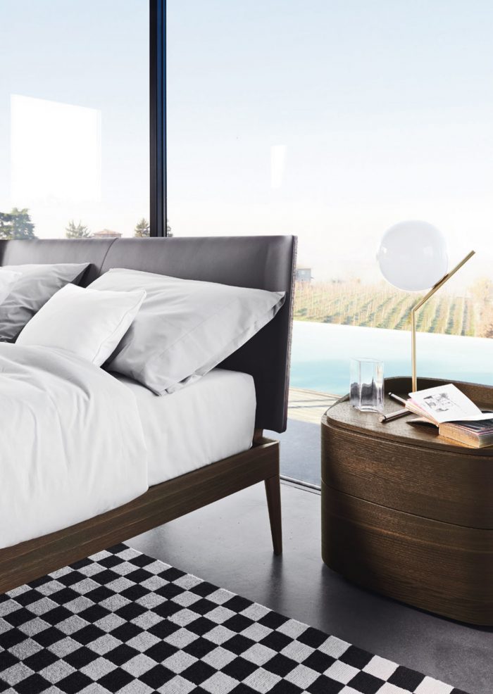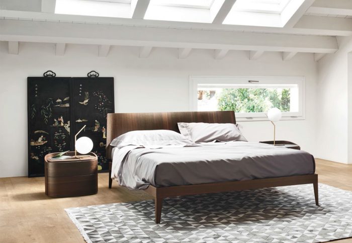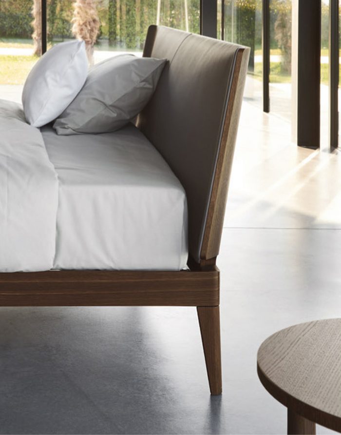 Cama con cabecero curvo suspendido sobre una bancada recta. El cabecero, fabricado sofisticadamente se inclina respecto a la vertical de la pata.