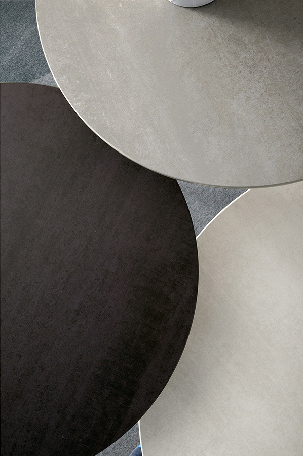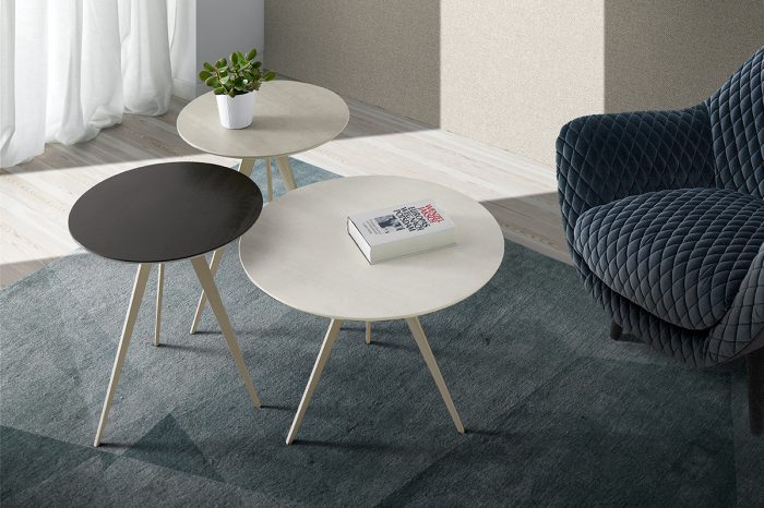 Mueble auxiliar compuesto por mesas de centro a distintas alturas y diámetros.