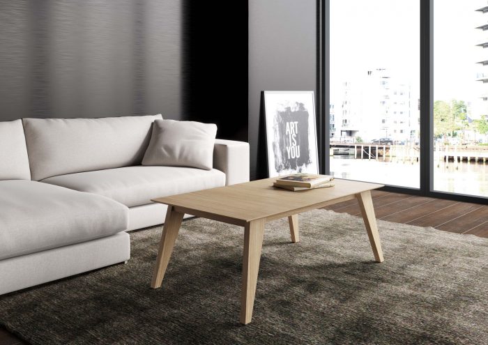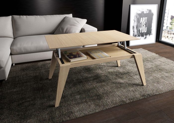 La mesa de centro puede llegar a medir hasta 58 cm de alto ya que su tapa es elevable, albergando así un espacio como revistero.