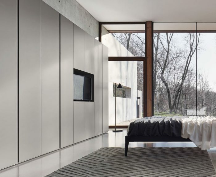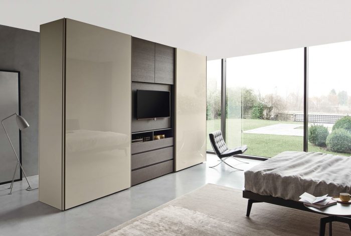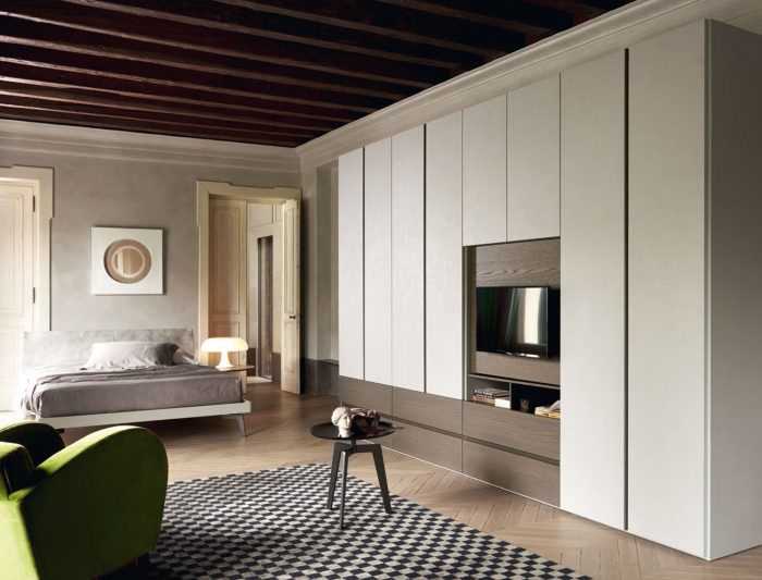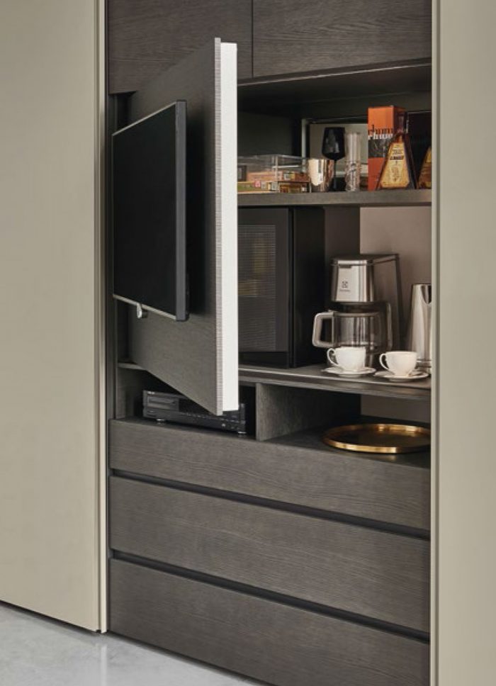 Armario caracterizado por la inserción de un módulo de televisión. Esta solución se combina con puertas y estantes.