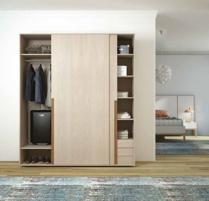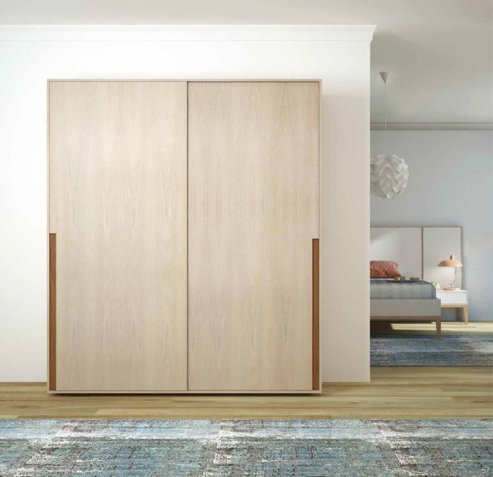Armario con puertas correderas apoyadas hecho a la medida. Los rodamientos de alta calidad con los que está equipado este armario proporcionan un deslizamiento de las puertas silencioso.