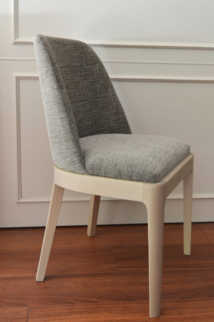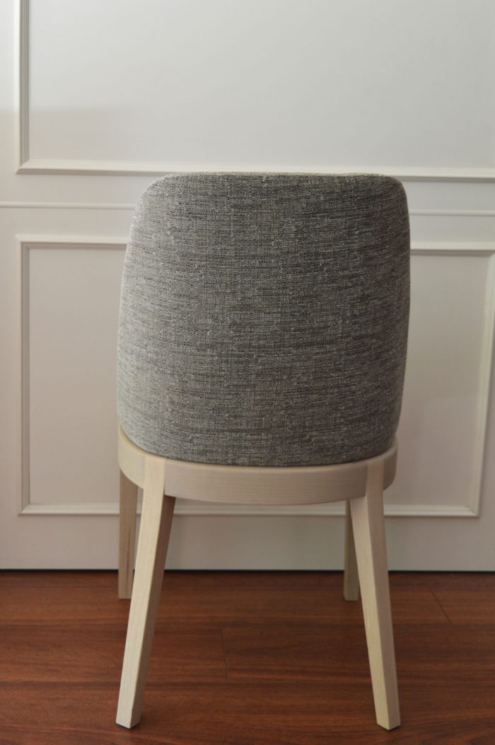 La silla destaca por sus detalles curvados tanto en el respaldo como en la estructura.