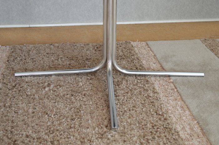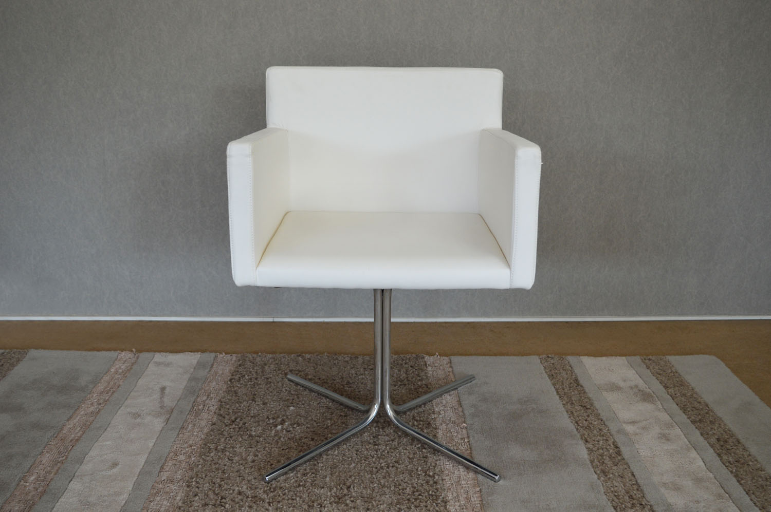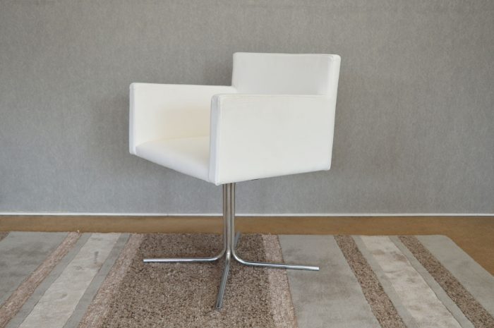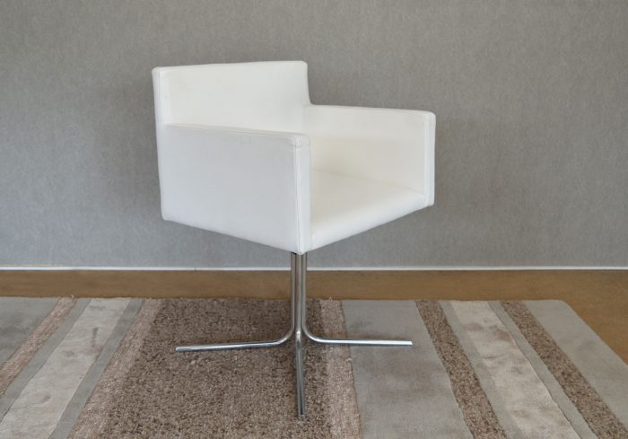 Silla rectangular en piel color blanco suspendido sobre una estructura en aspa cromada.